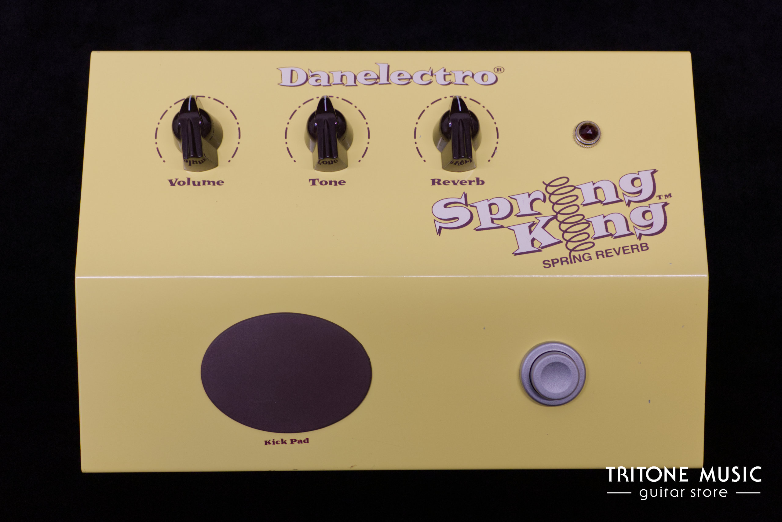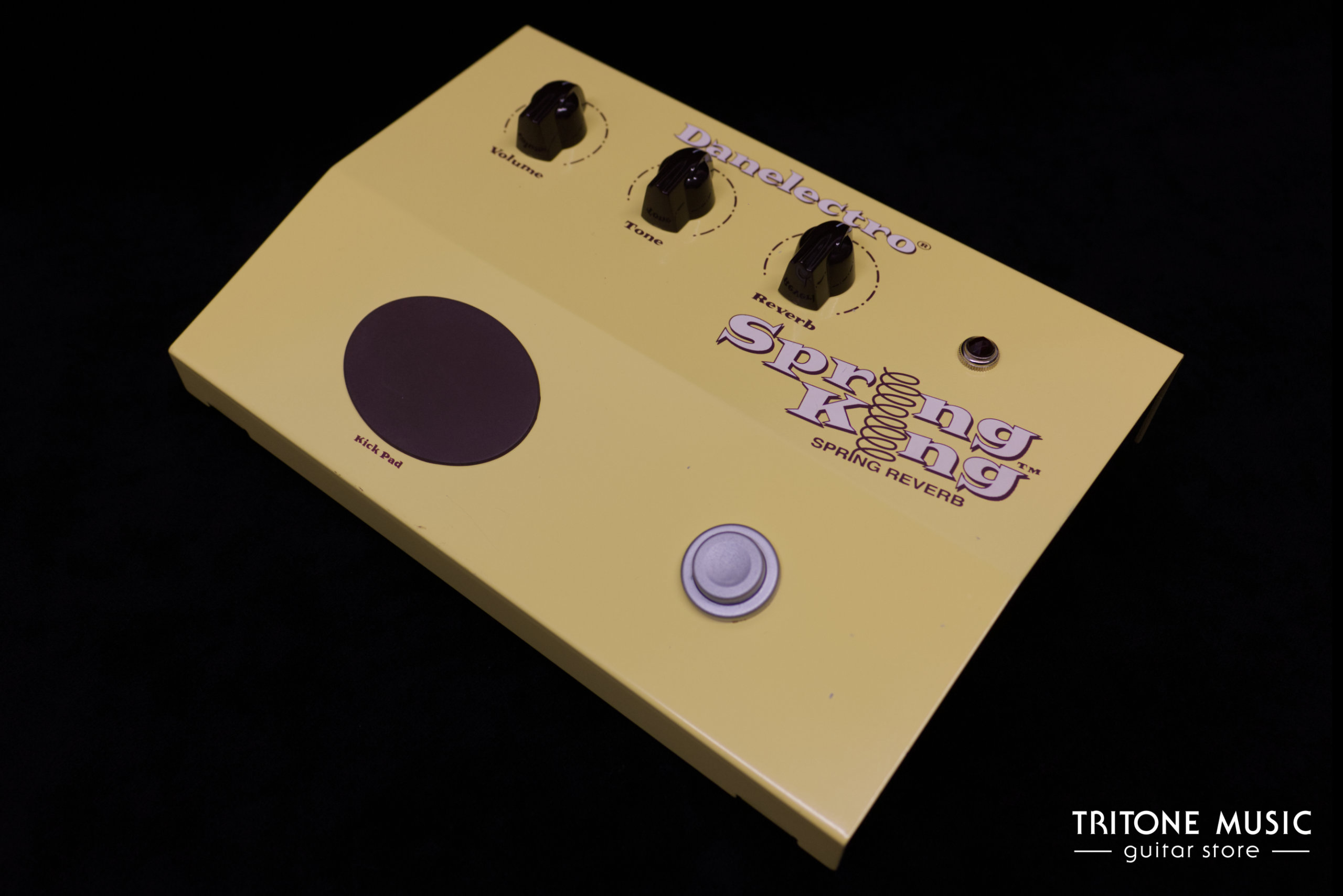 Das Pedal verfügt neben dem Ein-/Aus-Taster drei Regler: Volume, Tone und Reverb. Ein Gimmick ist das integrierte „Kick Pad“: Durch Antippen oder leichtes Treten wird die interne Feder in Bewegung versetzt und erzeugt einen typischen, scheppernden Federhall-Effekt, ideal für Surf, Rockabilly und experimentelle Sounds.