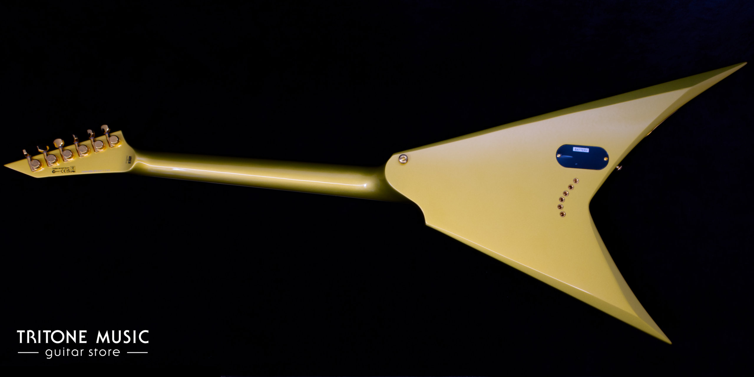 Die ESP LTD KH-V in ihrer auffälligen Metallic Gold Lackierung zählt zweifellos zu den markantesten Signature-Gitarren von Kirk Hammett, dem Lead-Gitarristen von Metallica.