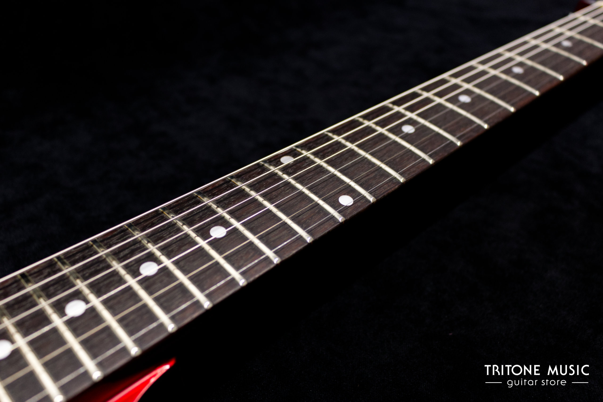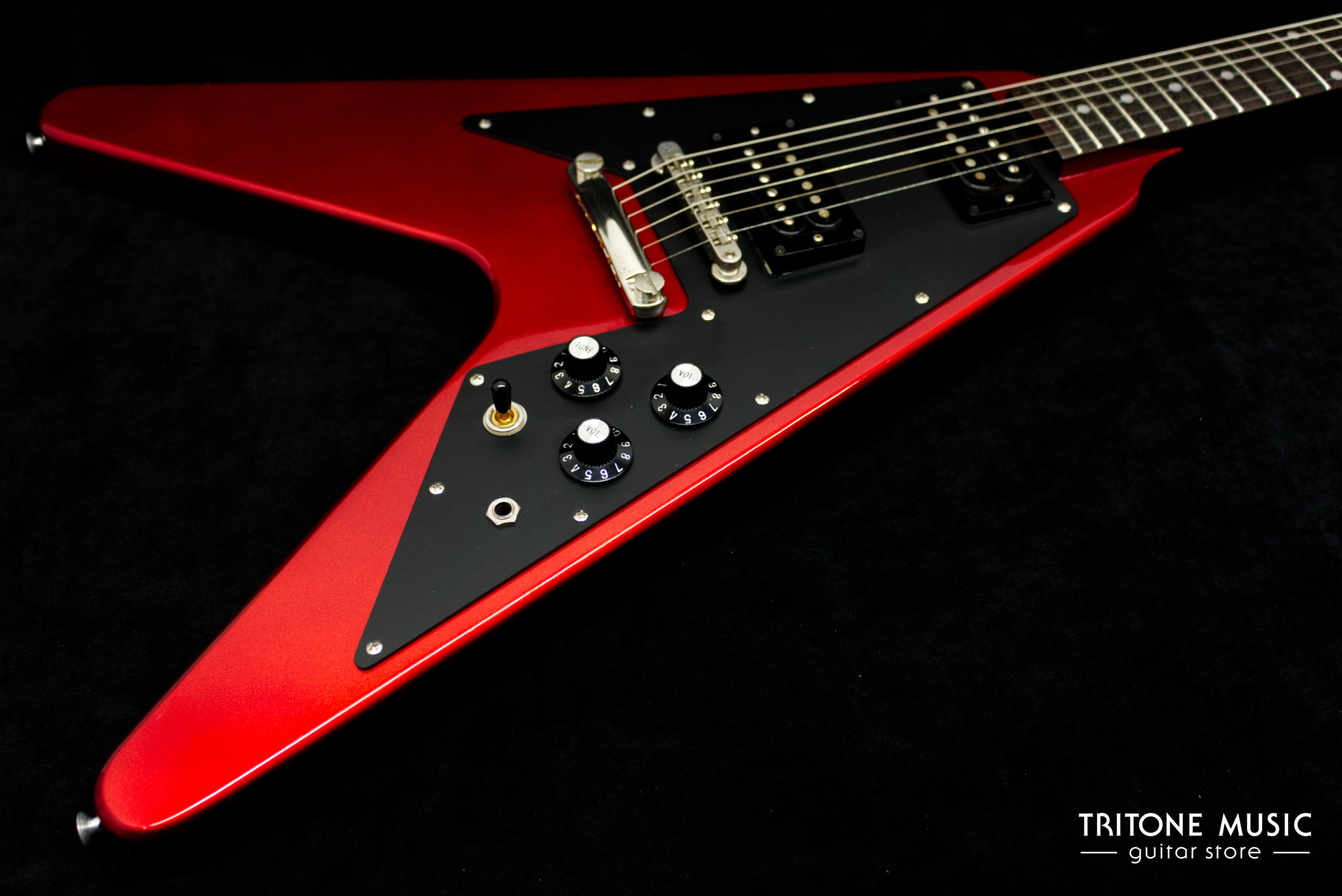 Diese seltene Greco FV-65 „Flying V“ in Metallic Red stammt aus dem Jahr 1982 und wurde in der renommierten Fujigen Gakki Factory in Japan gefertigt – ein gutes Beispiel für die hervorragende Qualität der sogenannten „Lawsuit-Ära“. Bis auf die nachgerüsteten Grover-Mechaniken befindet sich die Gitarre im Originalzustand. Der originale Metallic-Lack zeigt nach über 40 Jahren authentische Gebrauchsspuren wie Kratzer, Dellen und kleine Lackabplatzer, ist aber insgesamt gut erhalten. Eine echte Vintage-V mit Charakter – inklusive originalem roten Gigbag.