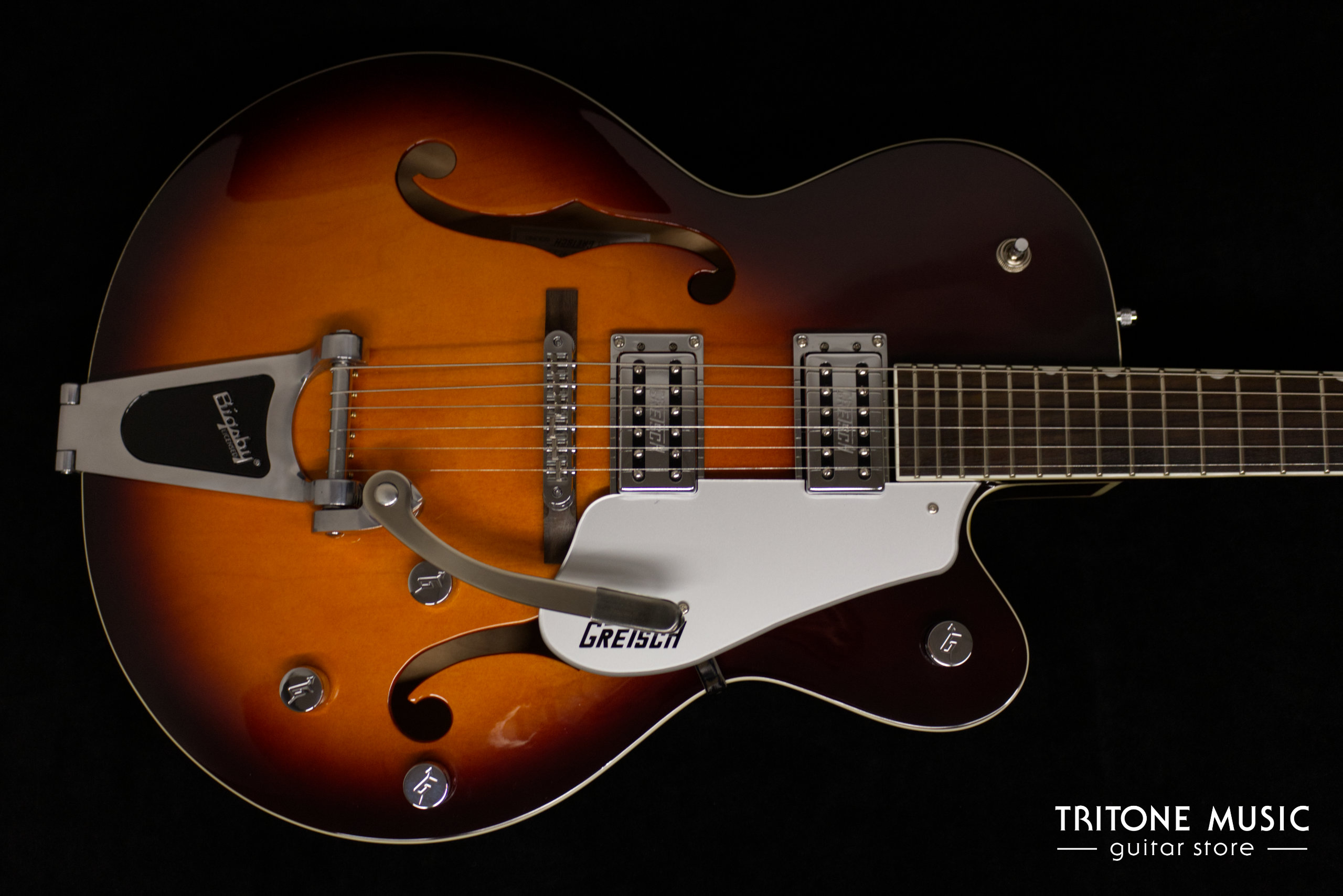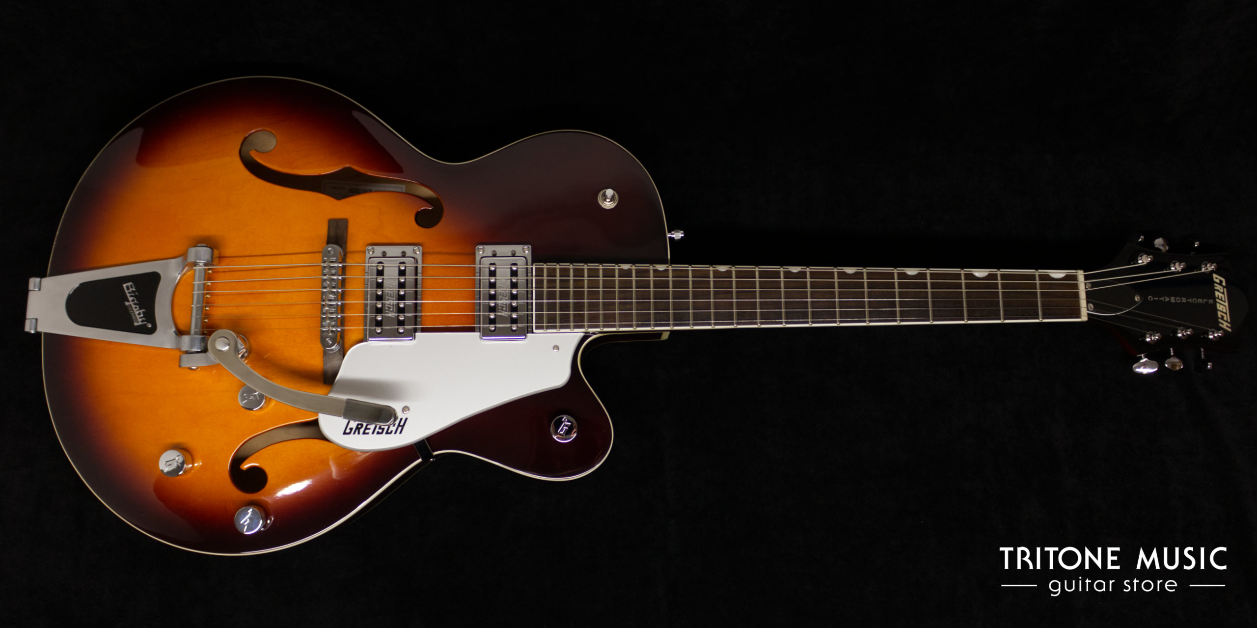Diese Gretsch G5120 Electromatic Hollow Body aus dem Jahr 2011 präsentiert sich im eleganten Sunburst-Finish und befindet sich in gutem, gebrauchten Zustand mit geringen Spielspuren. Einziger optischer Mangel ist ein Klarlackriss am Übergang zum Binding auf der Decke, nahe des Bigsby-Vibratos.