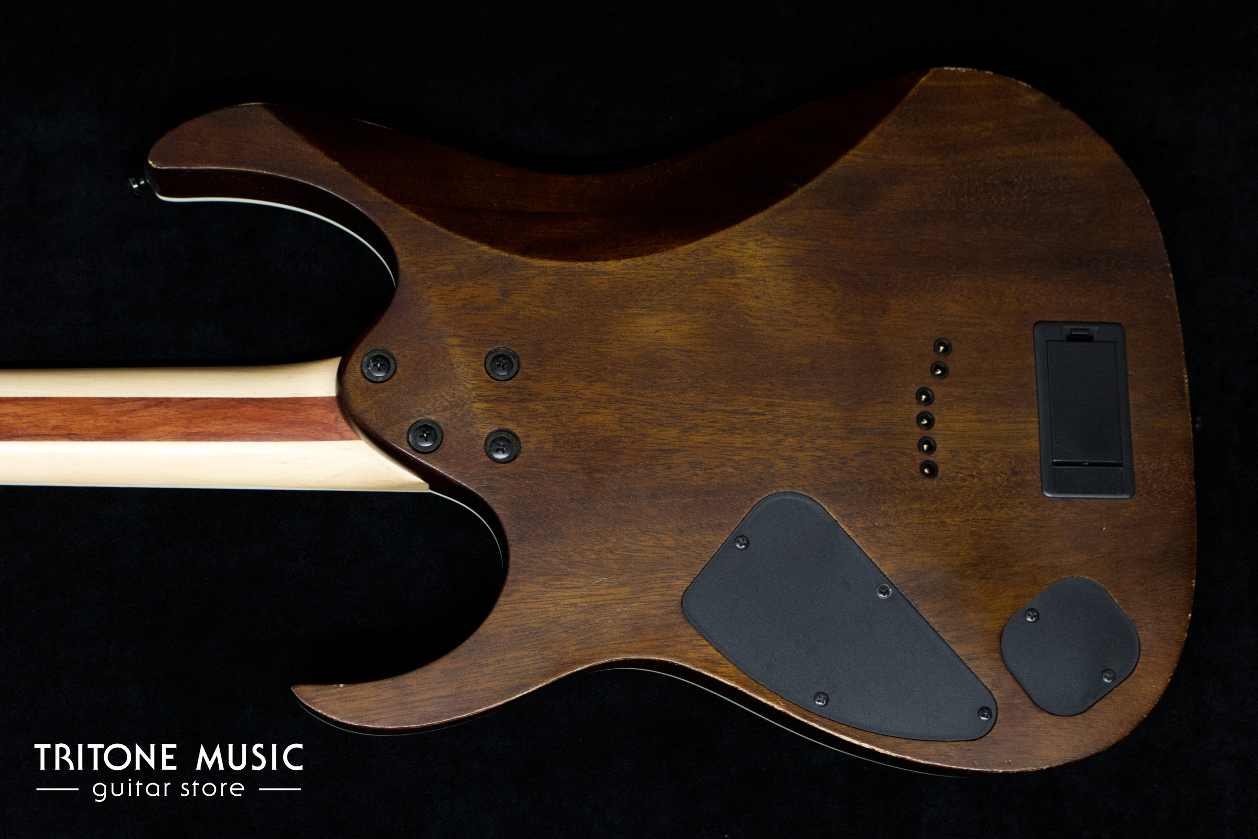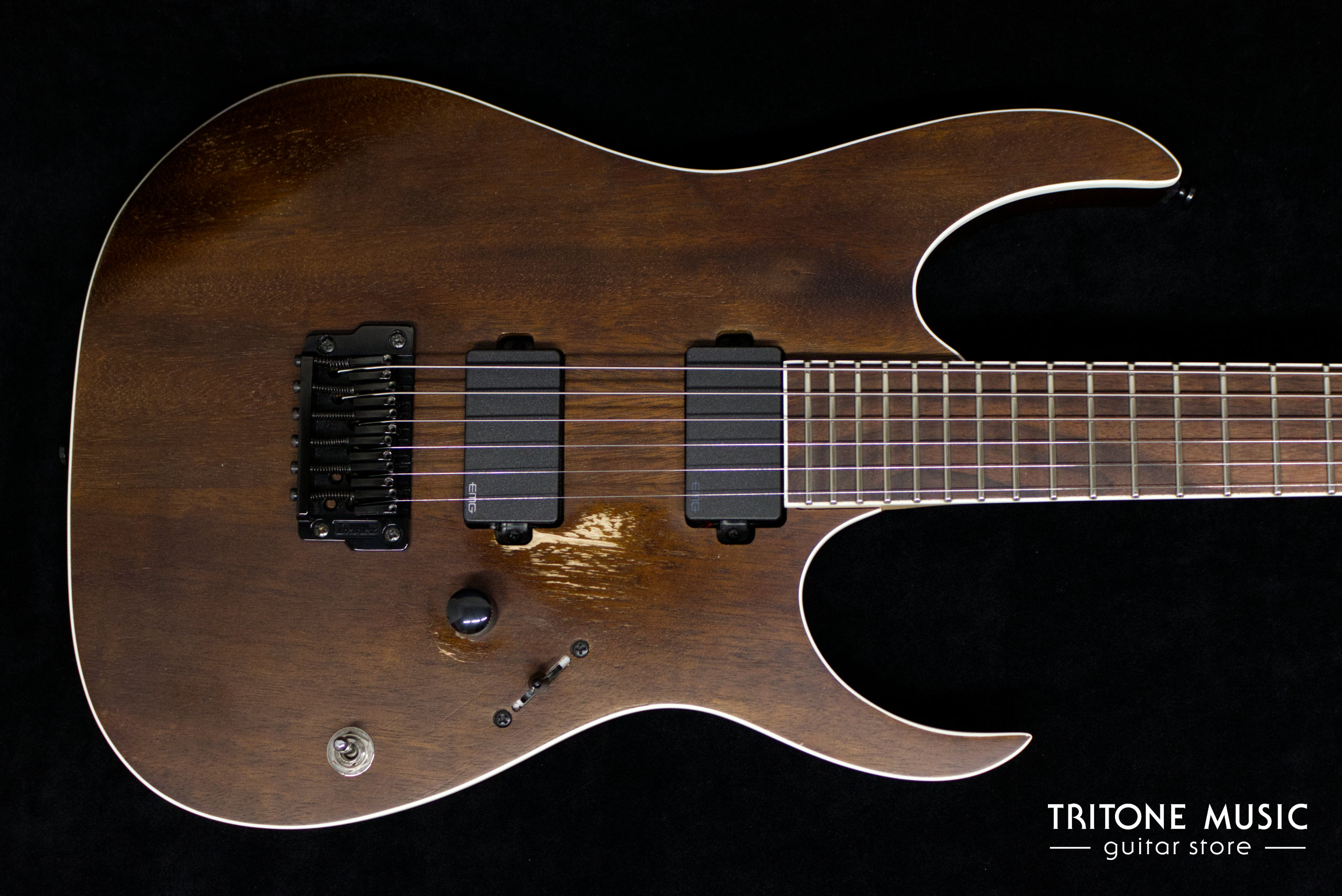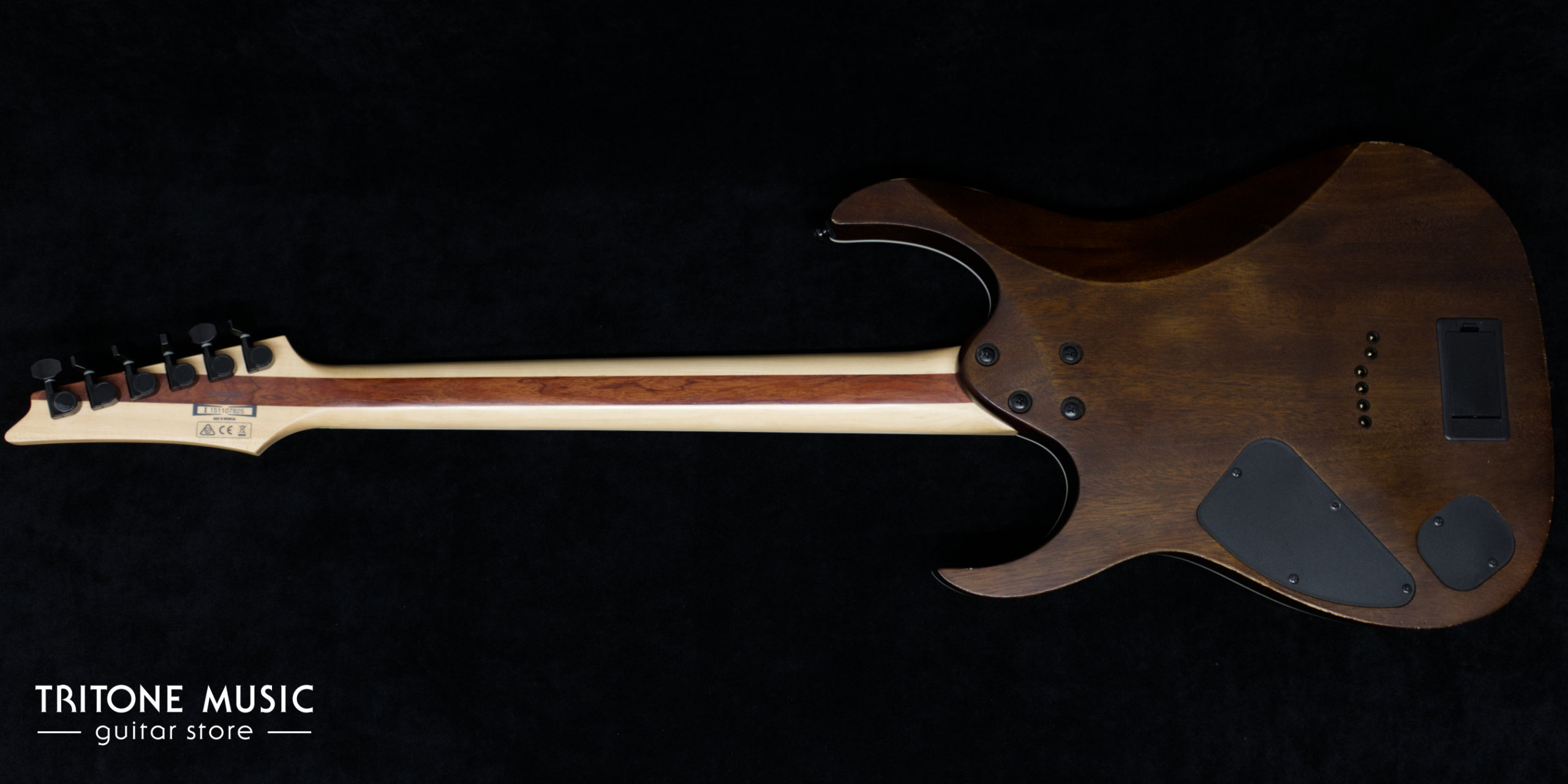 Diese Ibanez RGIR20BFE in Walnut Flat aus der Iron Label-Reihe wurde 2015 in Indonesien gefertigt. Sie besitzt einen Mahagoni-Korpus mit weißem Binding, einen geschraubten Nitro-Wizard-Hals aus Ahorn und Bubinga sowie ein 24-bündiges Palisandergriffbrett – ebenfalls mit weißem Binding und ohne Inlays. Zur Ausstattung gehören eine Gibraltar Standard II-Fixed Bridge, zwei EMG-Aktivhumbucker und ein Kill Switch. Das angebotene Exemplar zeigt starke optische Gebrauchsspuren; am Body wurde unterhalb des Bridge-Pickups durch das Pick Farbe abgetragen. Trotz der kosmetischen Abnutzung überzeugt die Gitarre durch eine fantastische Bespielbarkeit und ihr angenehmes Leichtgewicht von nur 2805g.