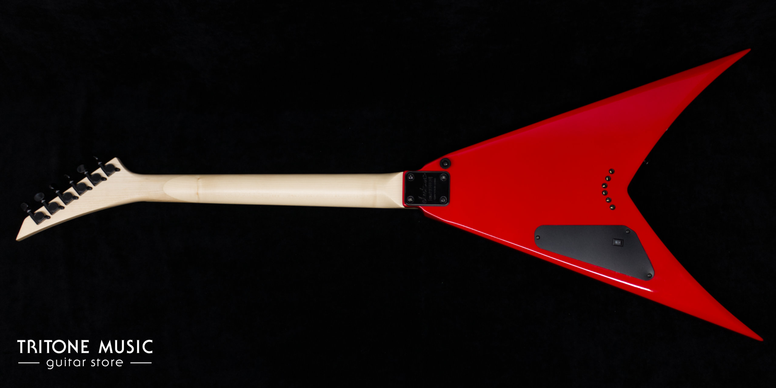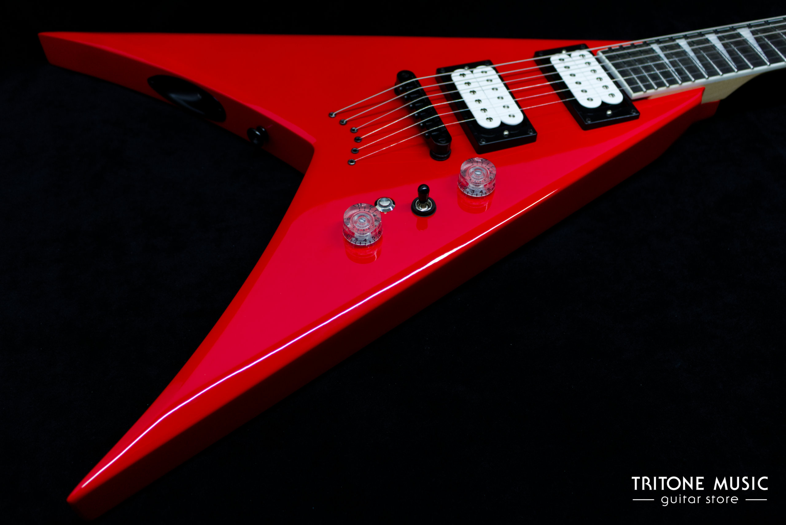Diese Jackson King V JS32T in Ferrari Red wurde 2023 gefertigt und befindet sich abgesehen von leichten Spielspuren in sehr gutem Zustand. Modifikationen umfassen Kluson-Mechaniken, ein Pickup-Upgrade und einen Kill-Switch mit zuschaltbarer LED.