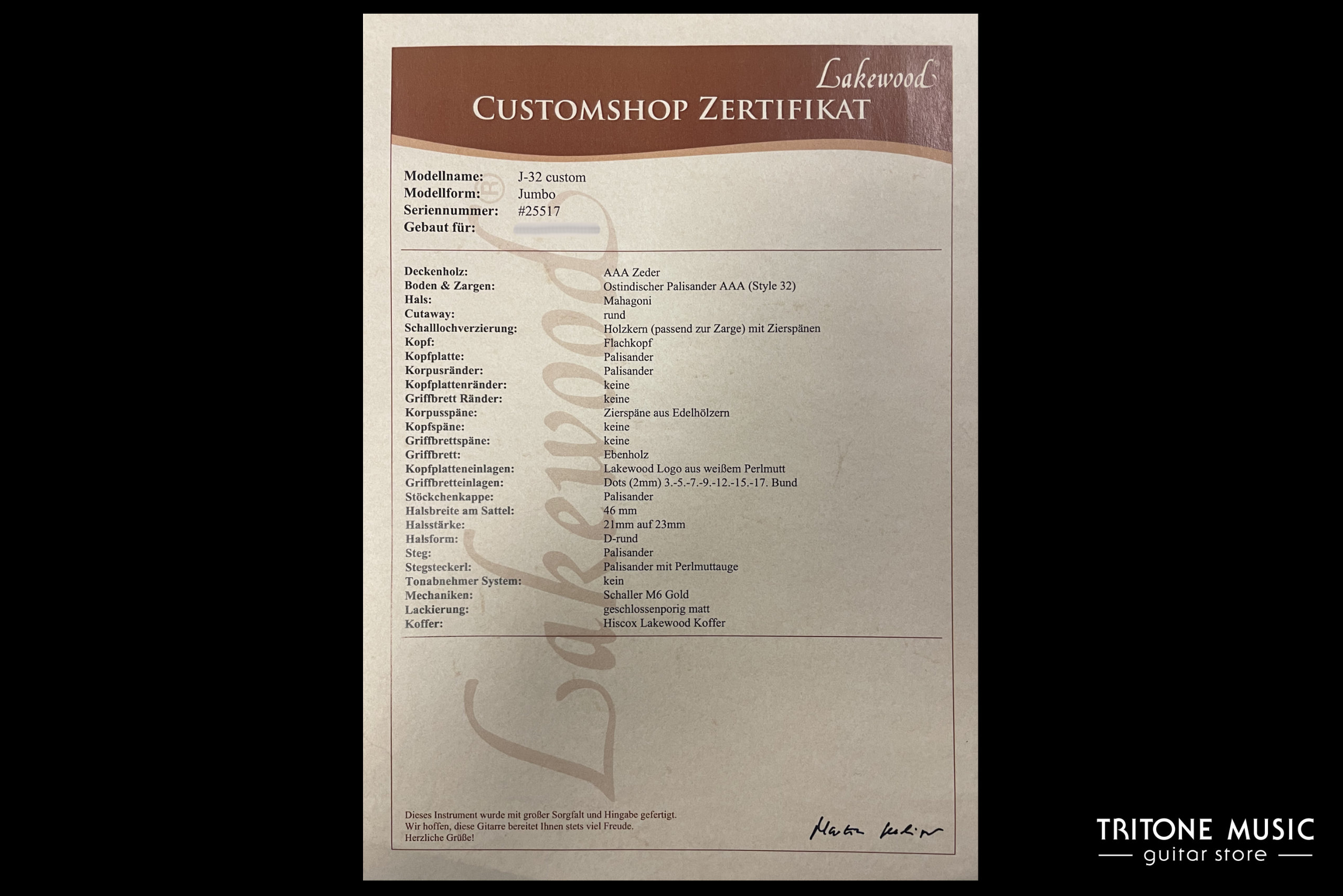 | Front Veneer | Rosewood with Pearl „Lakewood“ Logo Inlay | Number of Frets | 20 |