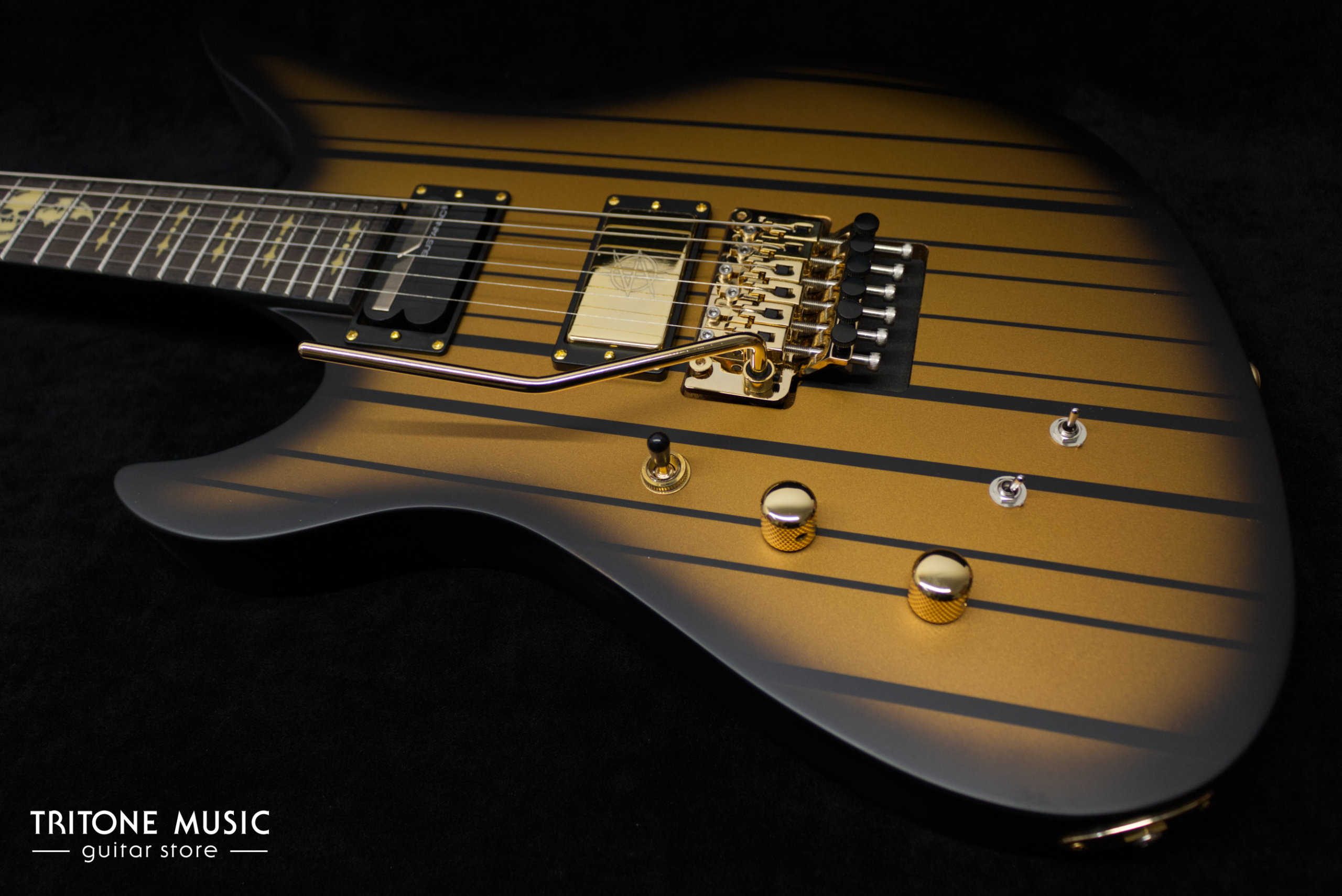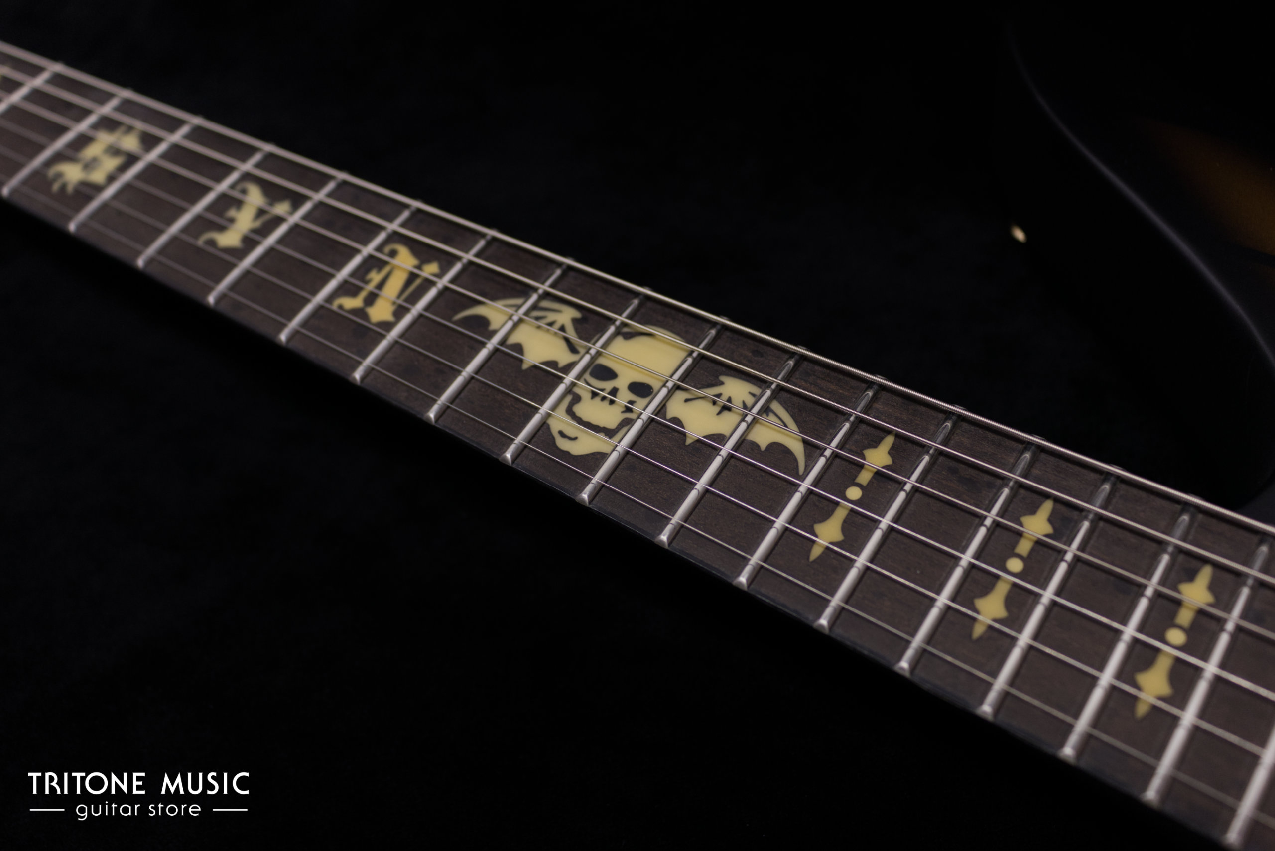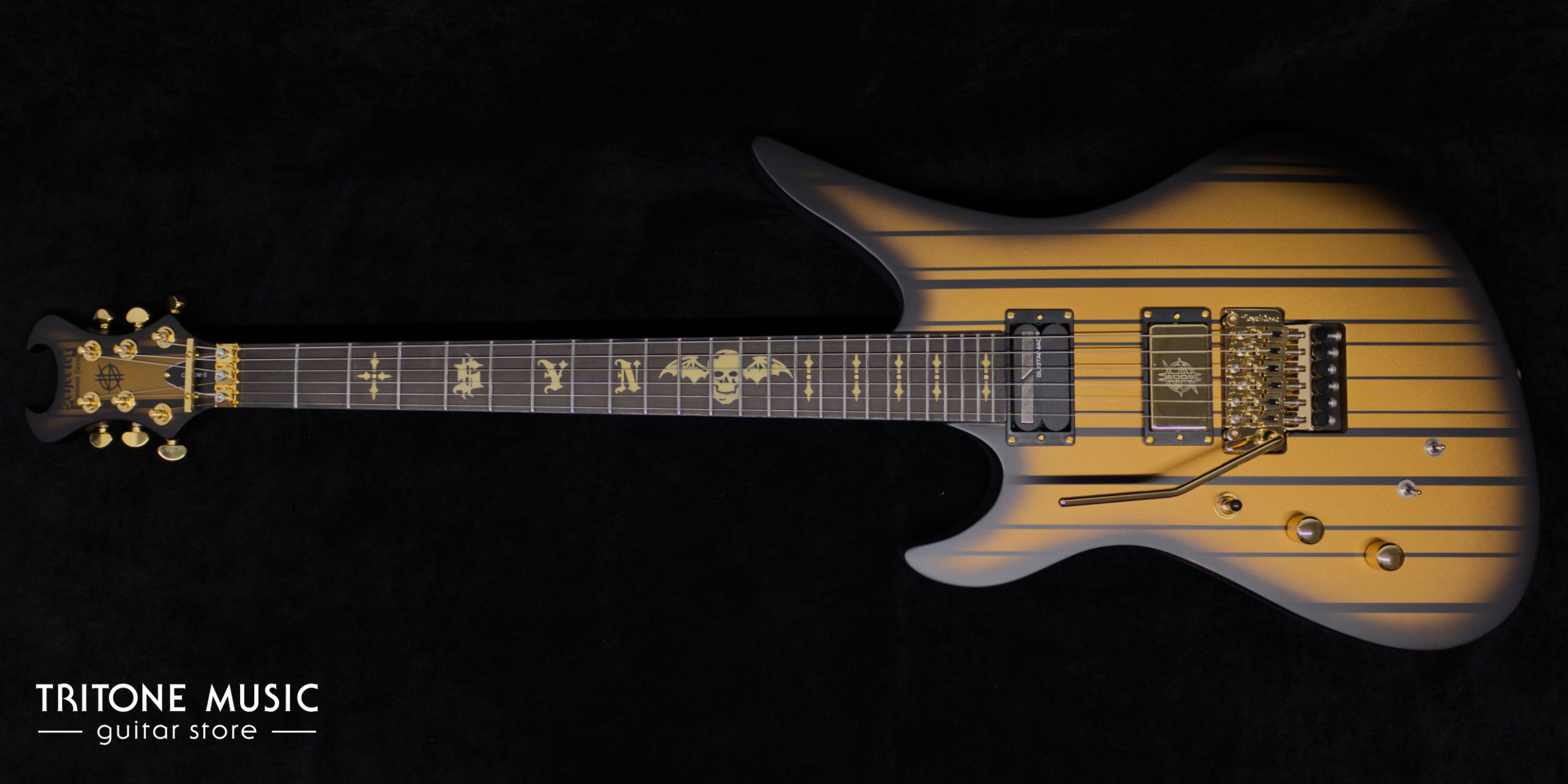 | Bridge | Floyd Rose 1500 Series / Gold | Inlays | Pearloid „Syn“ / „Death Bat“ at the 12th fret / Glow In The Dark“-Side Dots |
